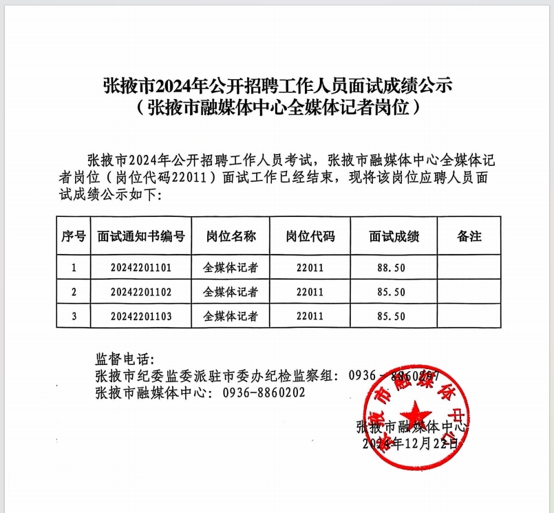 張掖市2024年公開招聘工作人員面試成績公示 (張掖市融媒體中心全媒體記者崗位)