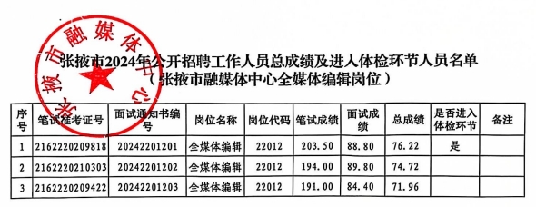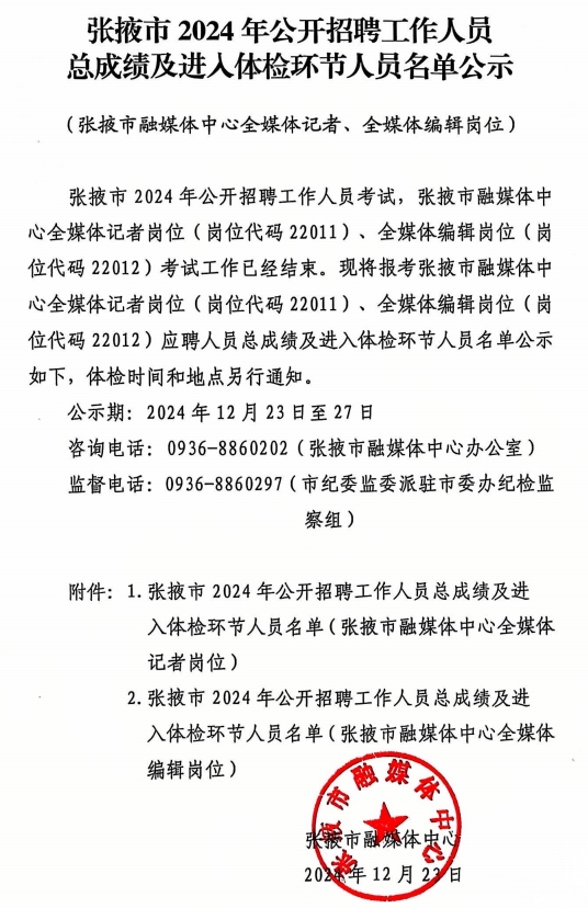 張掖市2024年公開招聘工作人員總成績及進入體檢環節人員名單公示