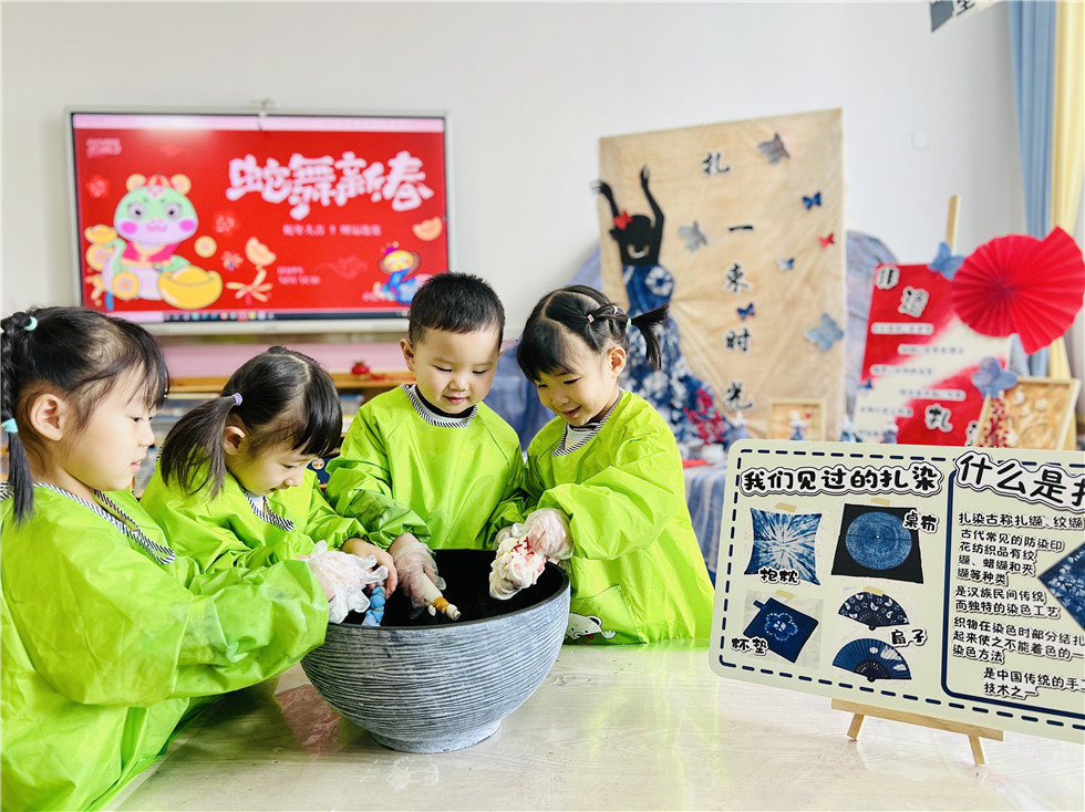 活動前期,各班教師創設了“迎新年”環境氛圍,幼兒在濃濃的活動環境中感受“新年”氣氛。教師們精心準備,通過多種生動直觀的方式引導幼兒認識“新年”,了解南北方慶祝新年的不同風俗,積累經驗,拓寬視野。活動中,幼兒敢于探究、樂于嘗試,精心拓印古老圖騰、福字吉言,領略傳統印刷術精妙;專注塑造陶泥,捏出萌趣可愛的各種形象,賦予傳統形象新生機;沉浸體驗扎染,在方巾與染料的折疊、捆扎、浸染中,感受色彩之美,紋理之妙。此外,幼兒還體驗嘗試了充滿趣味的絨花、魚燈、蠟染、漆畫葫蘆等非遺活動。