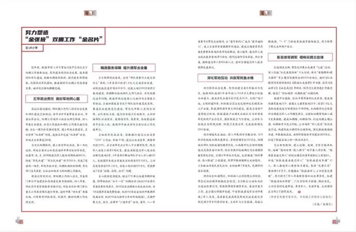 近年來,張掖市深入學(xué)習(xí)貫徹習(xí)近平總書記關(guān)于雙擁工作重要論述,聚焦服務(wù)經(jīng)濟(jì)社會(huì)發(fā)展、服務(wù)國(guó)防和軍隊(duì)建設(shè),創(chuàng)新雙擁體制機(jī)制,提升服務(wù)保障效能,鞏固軍政軍民團(tuán)結(jié),推進(jìn)新時(shí)代雙擁工作高質(zhì)量發(fā)展,被評(píng)為全國(guó)雙擁模范城。