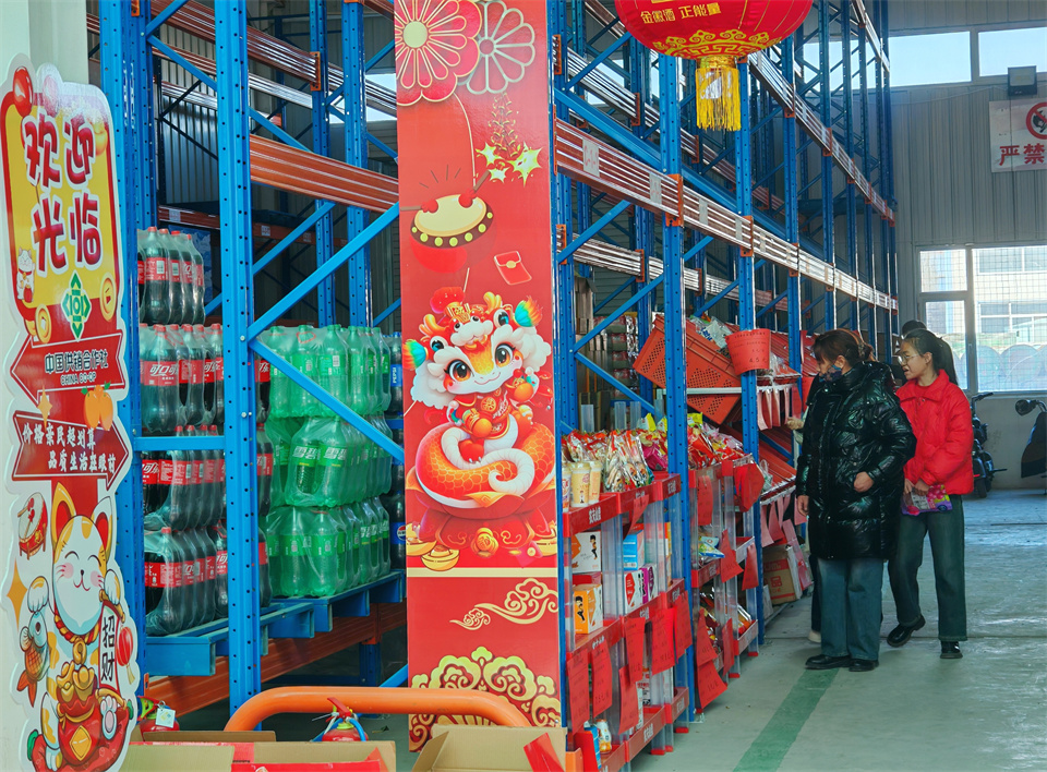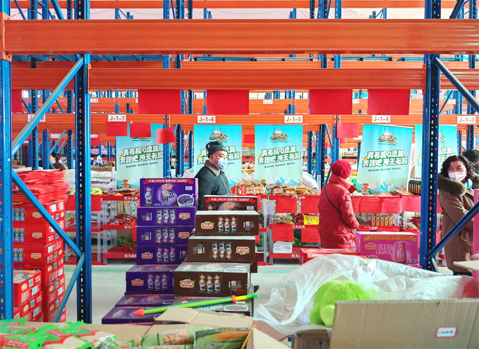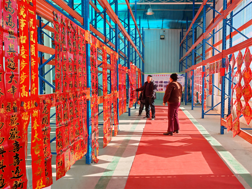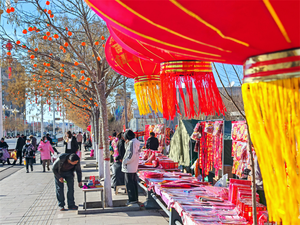 1月21日,山丹縣市民在一處年貨集市選購春聯等過節必備物品。