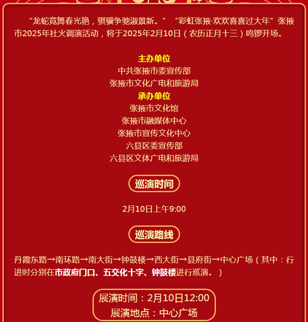 中國張掖網訊  “龍蛇竟舞春光艷,騏驥爭馳淑景新?!睘樯钊胴瀼芈鋵嶞h的二十大和二十屆三中全會精神,學習貫徹習近平文化思想,大力弘揚優秀傳統文化,豐富活躍城鄉群眾文化生活,營造歡樂祥和的節日氛圍。由中共張掖市委宣傳部、張掖市文化廣電和旅游局主辦,市文化館、市融媒體中心、市宣傳文化中心、六縣區委宣傳部、六縣區文體廣電和旅游局承辦的“彩虹張掖·歡歡喜喜過大年”張掖市2025年社火調演活動,將于2025年2月10日(農歷正月十三)鳴鑼開場。