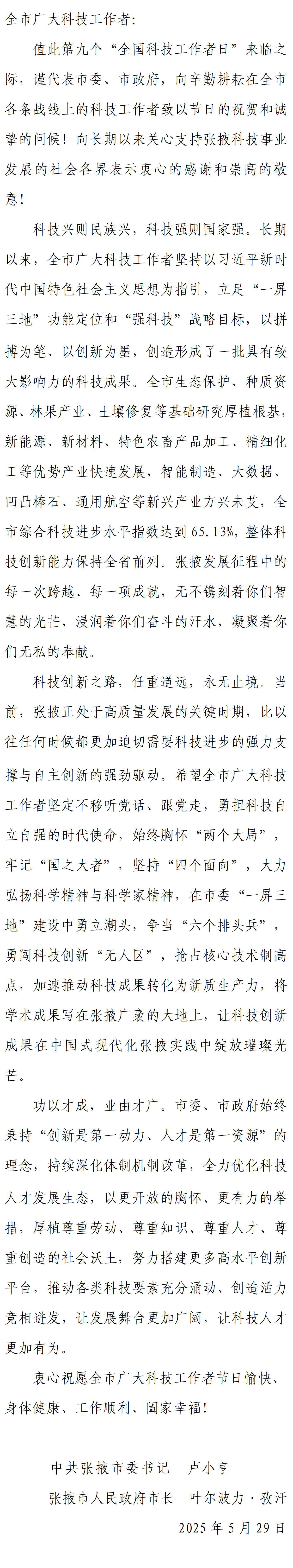 致全市科技工作者的慰問(wèn)信