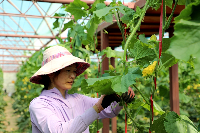 中國張掖網臨澤訊 近日,走進臨澤縣倪家營鎮汪家墩設施農業示范園區冬瓜種植基地,一壟壟冬瓜長勢喜人。農戶們穿梭其間牽藤吊蔓,整理冬瓜架,讓冬瓜保持旺盛生長。