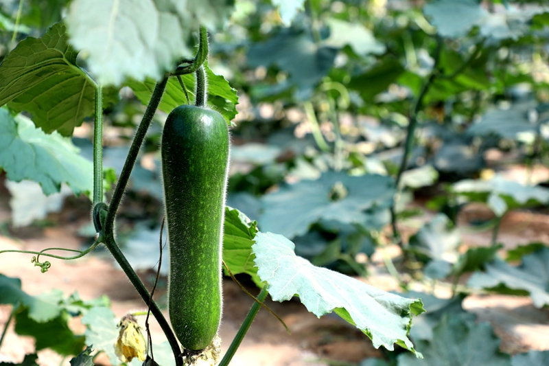 黑皮冬瓜口感爽脆、味道清淡,有清熱、利水、消腫的功效。倪家營鎮汪家墩采用“吊種+膜下灌溉”相結合的立體套種模式,最大限度利用空間,避免冬瓜與地面接觸,減少病蟲害,栽培出來的冬瓜瓜形優、個頭大、肉質敦厚,深受市場青睞。