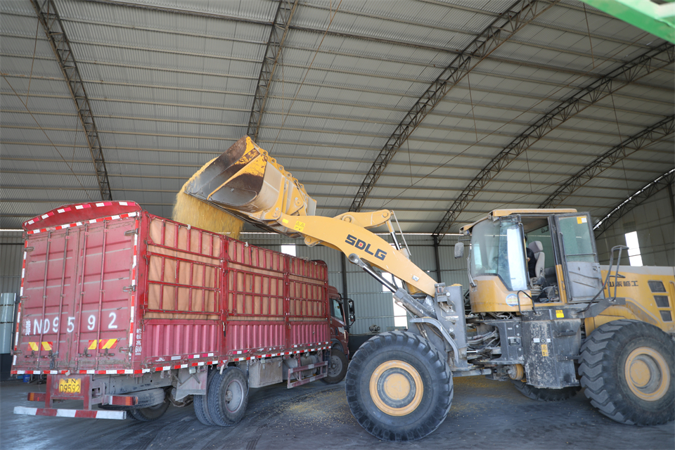 中國張掖網臨澤訊 近日,走進臨澤縣倪家營鎮和祥農副產品銷售有限公司,生產車間內機器轟鳴,金燦燦的壓片玉米從堆積如山的倉儲區被挖掘機鏟起后,倒入等待裝貨的運輸車車廂內。裝滿壓片玉米的運輸車一輛接一輛駛出廠房,將這批經過深加工的優質飼料原料運往省內外的養殖基地。